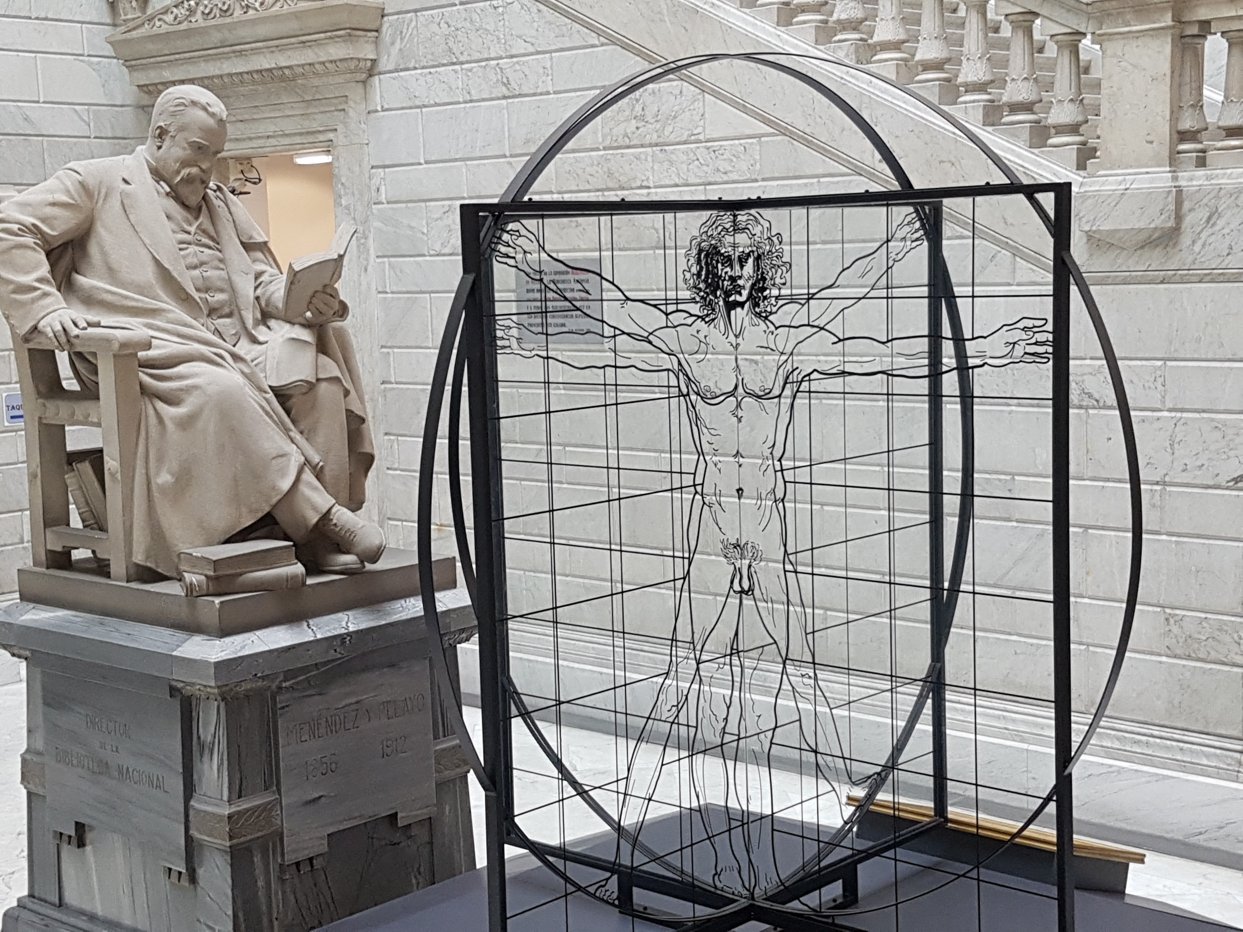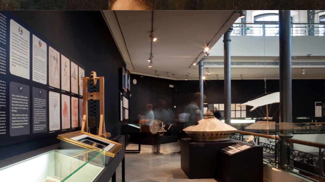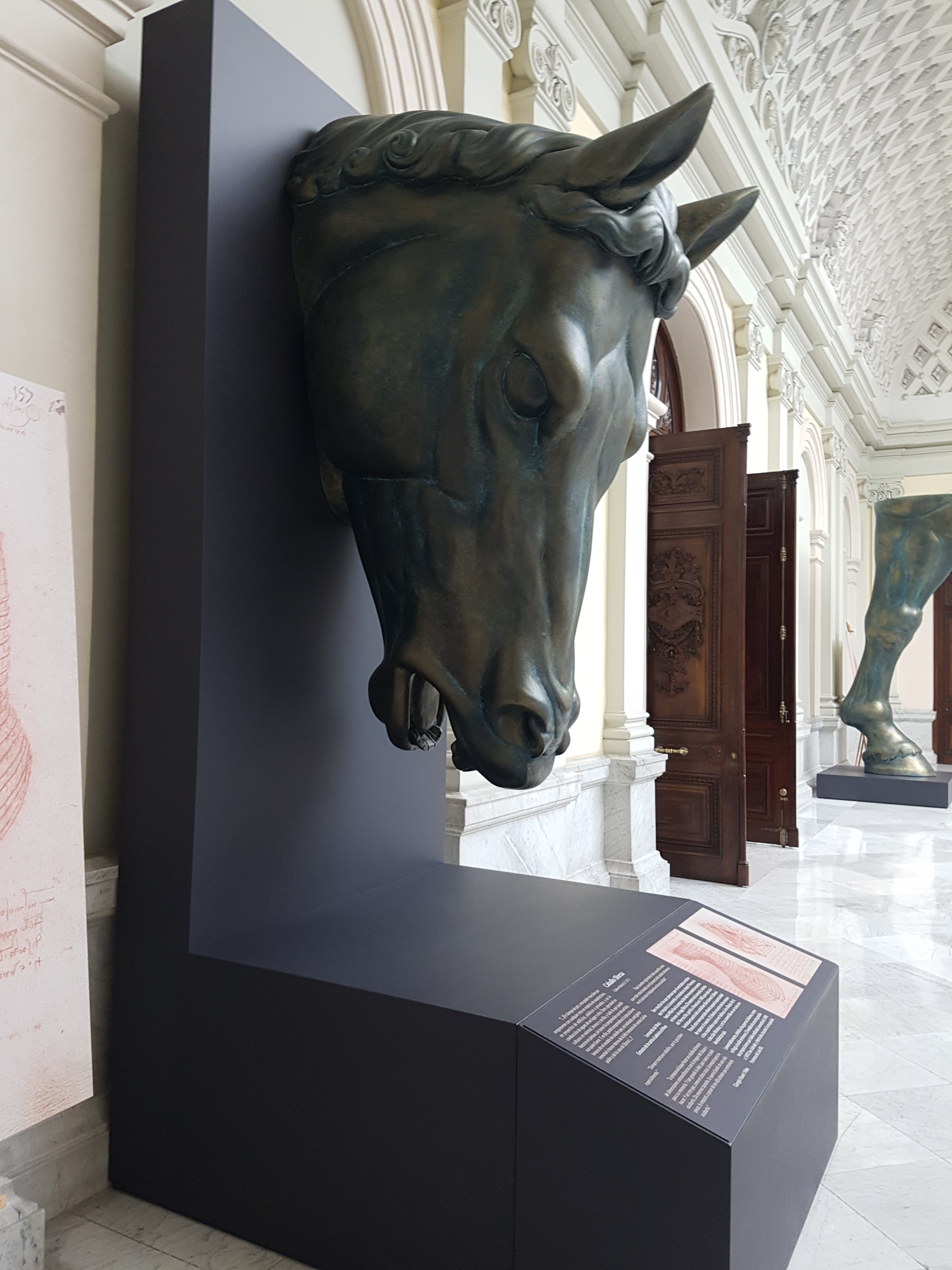 El vestíbulo de la Biblioteca es utilizado como espacio de la exposición donde se pueden ver reconstrucciones de máquinas presentes en los Códices Madrid I y Madrid II, así como uno de sus grandes proyectos: el enorme caballo diseñado para Ludovico Sforza.