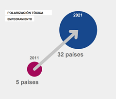 Una señal de polarización tóxica. Los argumentos y aspectos asociados del componente deliberativo de la democracia empeoraron en más de 32 países, otro aumento de solo 5 países en 2011.