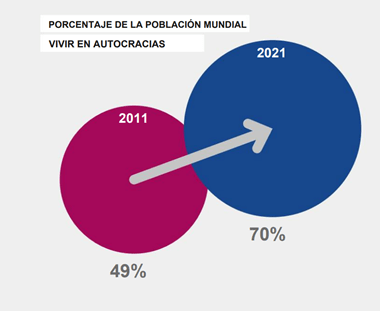 Con lo cual, el porcentaje de población que vivimos en democracia se reduce a un 30 % mientras que el porcentaje de la población mundial que vive en autocracia es del 70 %.