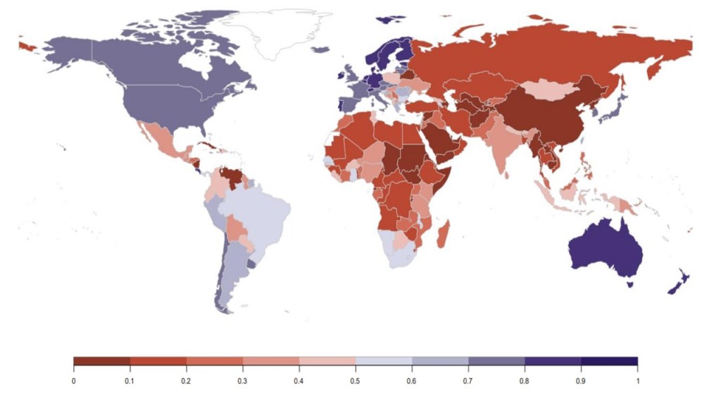 Los países identificados con el color azul más intenso son los más democráticos, mientras los identificados con el rojo más intenso son los más autocráticos.