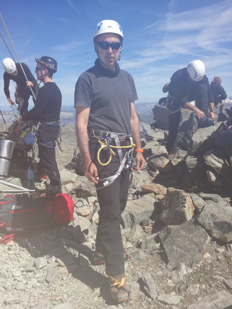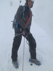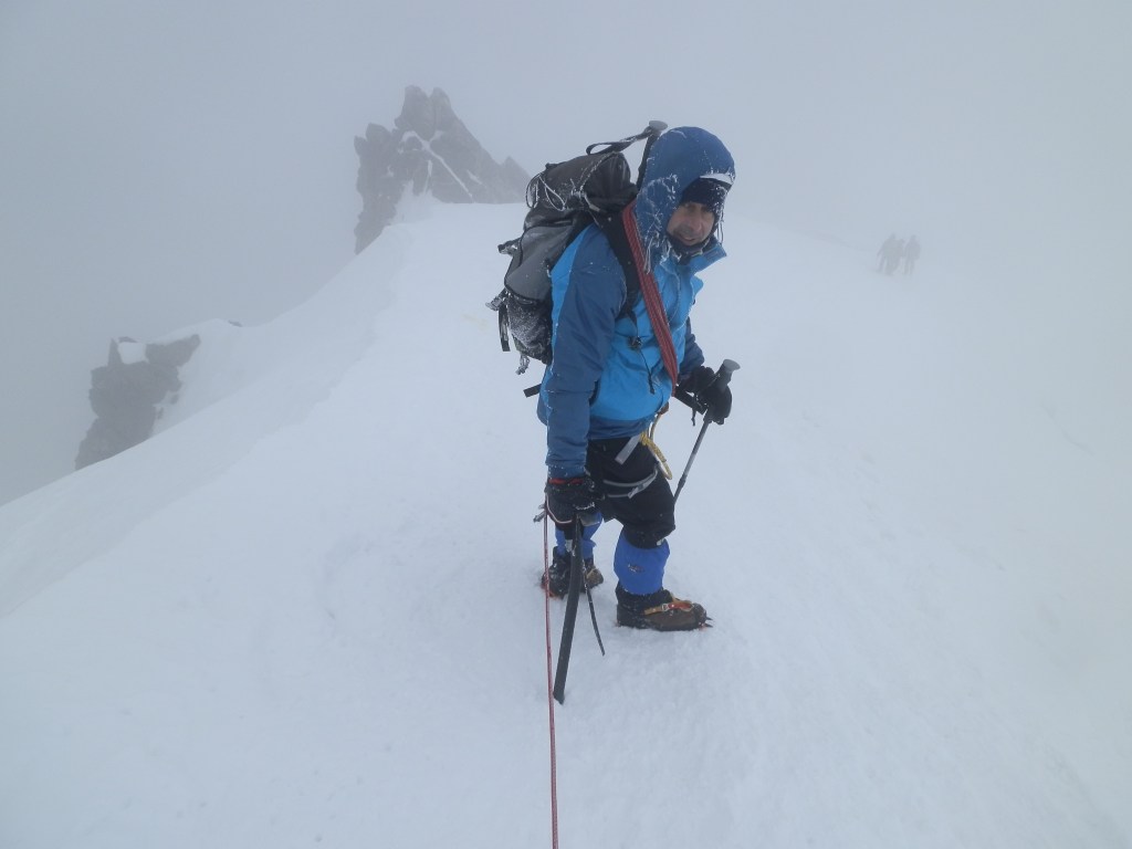 El esfuerzo era cada vez mayor, la falta de aclimatación se notaba, había hecho toda la montaña de primero en la cordada, estábamos llegando al final y tenía que realizar pequeñas paradas cada pocos pasos para llenar bien los pulmones, Jesús que se encontraba más suelto, pasó delante y yo ocupé su lugar, nos habíamos quitado las gafas porque con el espesor de la niebla no se veía nada, íbamos bien, con fuerzas, pero el paso era mucho más lento, sin darnos cuenta casi estábamos a pie de cumbre. Vimos a un grupo de montañeros parados donde ya no había más altura, Jesús gentilmente me volvió a cambiar el puesto para que volviese al primer lugar de la cordada para que yo hiciese los honores de hacer cumbre, todo un gesto por su parte, así pues, hicimos cumbre los dos. La cima es prácticamente horizontal, simplemente la arista alcanza su punto más alto. En la cima solo vimos una especie de ramillete de tiras que alguien la dejaría allí, y un grupo de montañeros, creo que eran belgas o algo así, no recuerdo muy bien, la cuestión es que aprovechamos para que nos sacaran unas fotos testimoniales de cumbre.