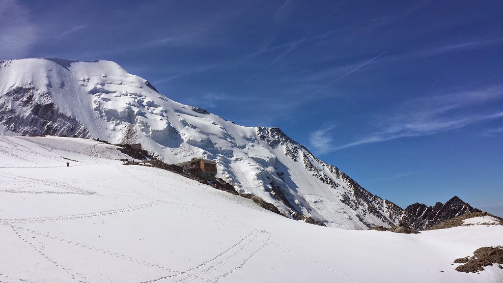 El primer punto de referencia por el que teníamos que pasar es el refugio Tete Rouse a 3167 m., el desnivel ya se notaba, en la zona del refugio tete Rouse, ya nos encontramos con la primera cuenca de nieve, por lo que en una caseta de información turística que hay unos 100 m. antes, nos dispusimos a pertrecharnos: crampones, piolet, arnés,..