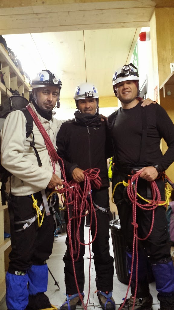 Cuando nos dimos cuenta estábamos prácticamente solos, nos encordamos y con muchos nervios nos dispusimos a salir en mitad de la noche y a 3.800 m. con nuestros frontales.