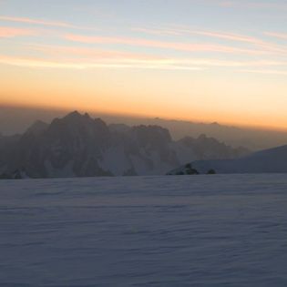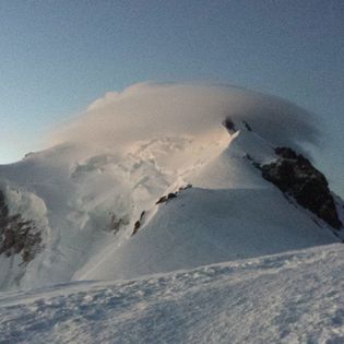 El momento en el que alcanzamos la Dome de Gouter fue cuando empezó a clarear el día y cuando el frío se hizo más intenso, es un punto en el que dejas de subir, llaneas un poco, incluso bajas antes de seguir subiendo hasta el refugio Avalot, con lo cual el cuerpo realiza menos esfuerzo y por ende genera menos calor, y al coincidir el momento del alba, la sensación de frío fue potente, en ese momento también pudimos contemplar como una gigante nube lenticular se iba adueñando de la cima de la montaña.