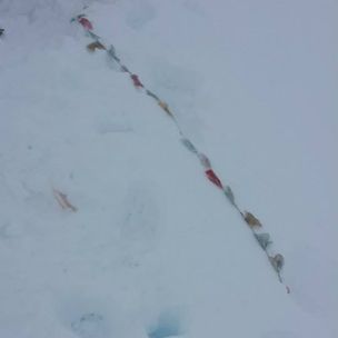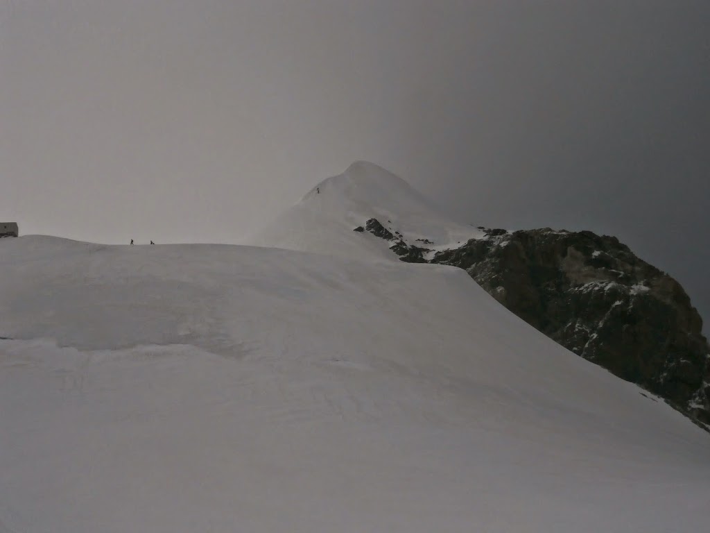 Nos encordamos los dos y salimos por la trampilla al exterior, encaramos una rampa con bastante inclinación pero el paso de los montañeros anteriores nos habían dejado una escalera perfectamente hecha, la nube que rodeaba la montaña cada vez estaba más espesa, la mayoría de la gente se daba la vuelta, pero nosotros continuábamos,