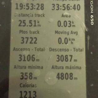 Las vistas fueron nulas prácticamente, en algún momento el azul del día se apreciaba por encima de nuestras cabezas, parecía que iba a despejarse de nubes, pero finalmente volvió a oscurecerse y la verdad es que vistas, vistas, no vimos ninguna, pero la sensación de hacer cumbre en esas condiciones os aseguro que fue potente, lo celebramos y disfrutamos de la cumbre durante unos minutos, testimoniamos la altitud en el GPS que nos había dejado Fran y nos dispusimos a bajar.
