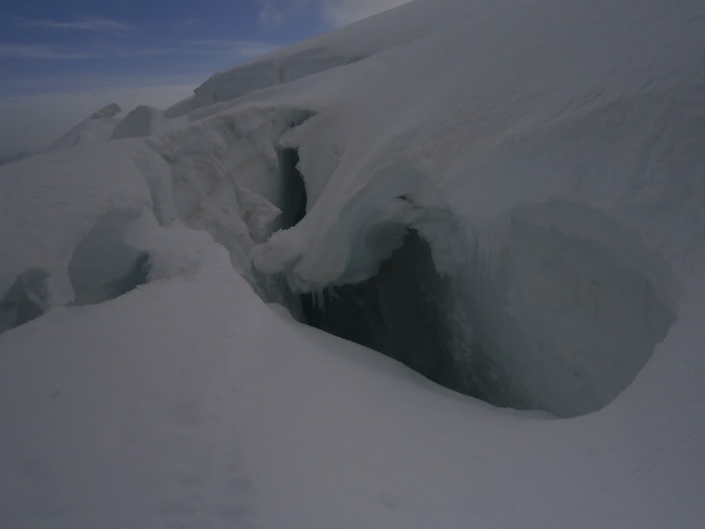 A medida que avanzábamos y salíamos de la balconada, el viento aflojaba, subíamos bien, parando en alguna ocasión para no perder la coordinación del ritmo entre los tres y tomar algo, tuvimos que salvar una buena rampa hasta la dome de Gouter, desde allí pudimos ver el refugio de Avalot, pero antes durante el trayecto nos encontramos con algunas grietas que hubo que salvar.